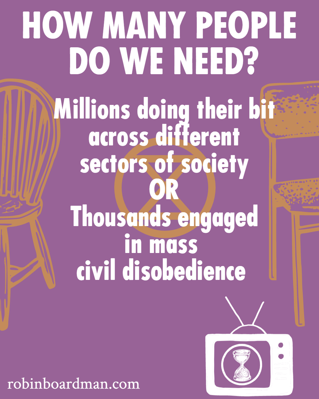 I believe there are sufficient numbers to do effective civil resistance now. I have empirical evidence from doing 5 talks a week - at each talk, 2/3 people will agree to civil disobedience to the point of risking prison. We know that sufficient numbers can create huge changes, such as police reform in Minnesota after BLM protests or even the recent motorway protest in Serbia that won legislative change to stop the country being exploited by Transnational corporations for mining rights. So we know this is how political change works.