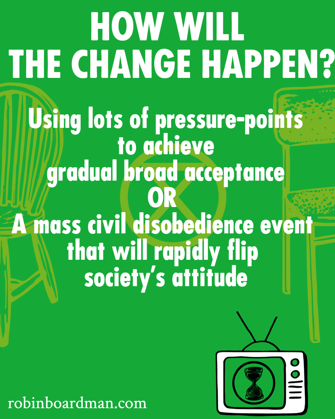 RH - Through a mass civil disobedience event that will rapidly flip society’s attitude.
