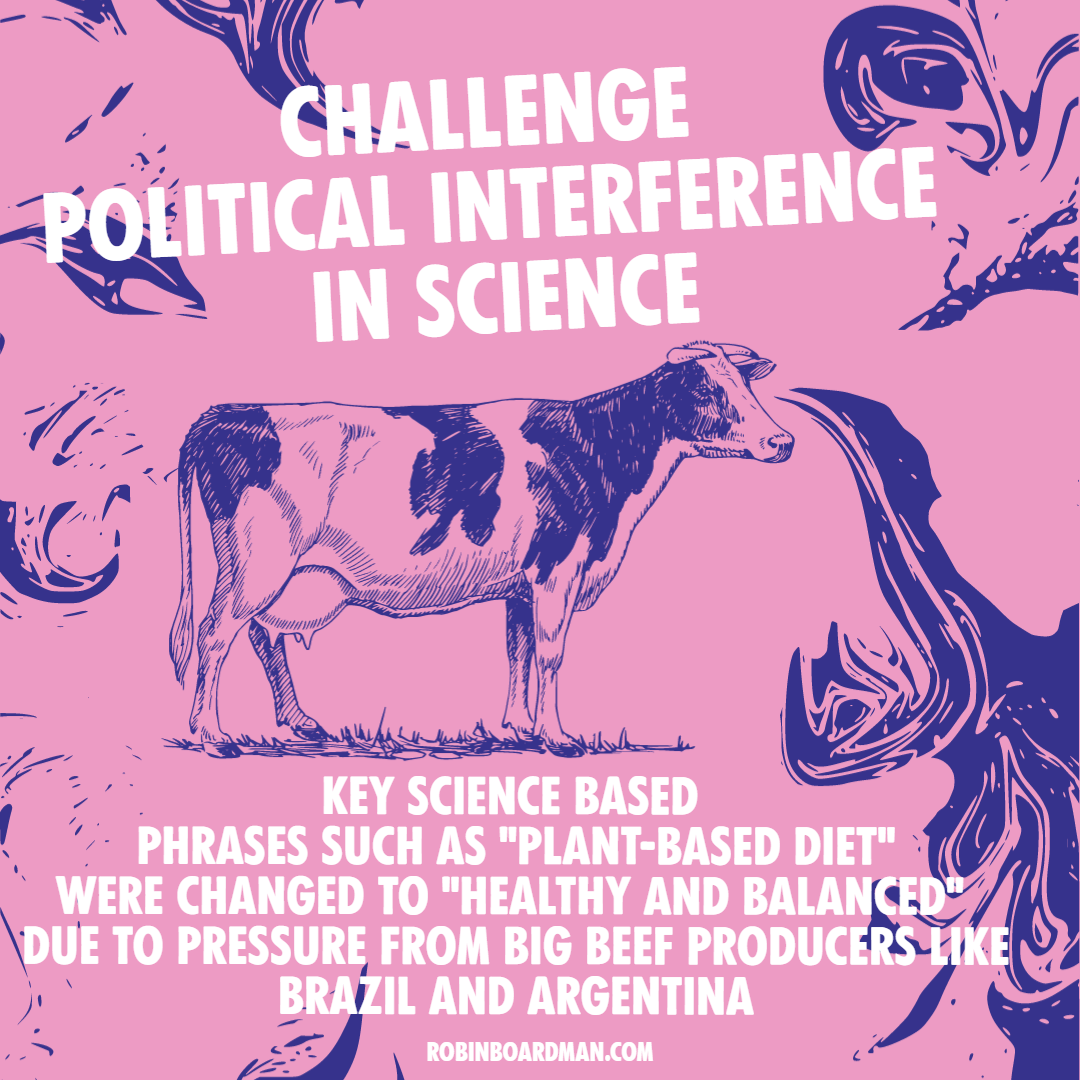 One of the key elements activists need to challenge the IPCC report on is the political interference of stakeholder countries in its creation. The language used in the “Summary for Policymakers” has been massively weakened by changes to the language on fossil fuels and dietary change. After pressure from Saudi Arabia, the language on fossil fuels suggests a transition away from fossil fuels rather than phasing them out entirely. This is dangerous as it positions fossil fuels as part of the solution, whereas the science is clear that we need to stop using them entirely. The original report, leaked by Scientist Rebellion, suggested "plant-based diets" to reduce emissions but due to pressure from Brazil and Argentina, large beef exporting countries, this was changed to the ambiguous "balanced and healthy diets". Meat and dairy are then totally ignored in the final report despite them emitting 15% of total global emissions. These changes from the original reports show the scale of political intervention in the science and rise of meaningless political phrases. If we want meaningful reports we need to pressure the IPCC to ditch government influence and stick to the science.